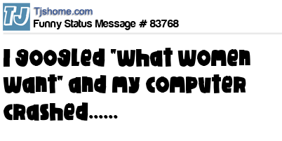 - # 83764 I googled "what women want" and my screen froze, then my computer started to smoke and caught on fire then exploded.