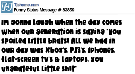 X Im gonna laugh when the day comes when our generation is saying "You spoiled little brats! All we had in our day was Xbox's, PS3's, iphones, flat-screen tv's & laptops, you ungrateful little sh!t"