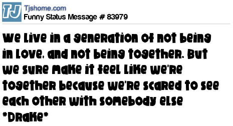 X We live in a generation of not being in love, and not being together. But we sure make it feel like we're together because we're scared to see each other with somebody else *Drake*