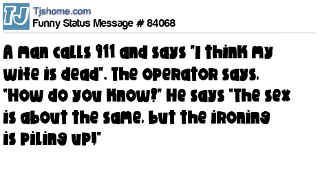 - # 16149 A man calls 911 and says "I think my wife is dead". The operator says"Why do you think that?". The man says, "well, the s*x is still the same but the laundry is piling up."