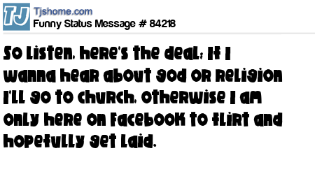 X says So listen, here's the deal; If I wanna hear about god or religion I'll go to church, otherwise I am only here on Facebook to flirt and hopefully get laid.