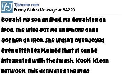- # 99124 I just bought my daughter an iPad, my son an iPod, myself an iPhone...and the wife an iRon. She wasn't impressed even after I explained it can be integrated with the iWash, iCook and iClean network. This sadly triggered the iNag service, which in turn wip