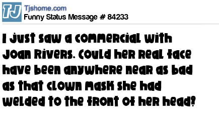 X I just saw a commercial with Joan Rivers. Could her real face have been anywhere near as bad as that clown mask she had welded to the front of her head?