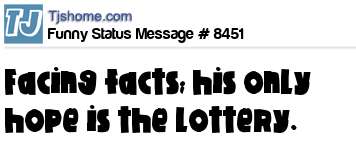 - # 102266 A man lying in bed facing his wife, looks into her eyes and says, "Looking at your face reminds me of the lottery babe", She replies "You mean I'm worth millions?" He says "No I wish you would roll over !"