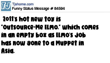- # 118270 The Hot New Toy this Christmas season will be "Outsource Me Elmo" Which is simply an empty box as Elmo's job has now gone to a Muppet in Asia.