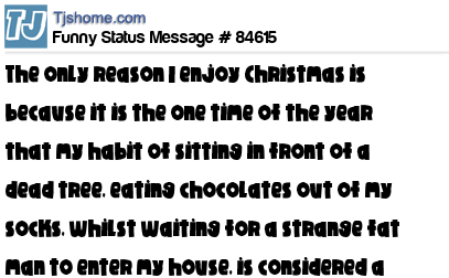 X says the only reason I enjoy Christmas is because it is the one time of the year that my habit of sitting in front of a dead tree, eating chocolates out of my socks, whilst waiting for a strange fat man to enter my house, is considered a normal event!