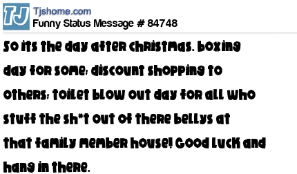 X is So its the day after christmas. boxing day for some; discount shopping to others; toilet blow out day for all who stuff the sh*t out of there bellys at that family member house! Good luck and hang in there.
