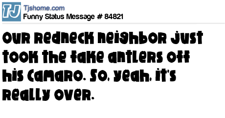 X Our redneck neighbor just took the fake antlers off his Camaro. So, yeah, it's really over.