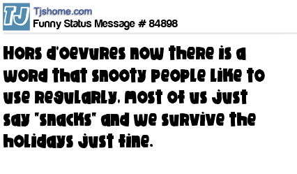 X hors d'oevures now there is a word that snooty people like to use regularly, most of us just say "snacks" and we survive the holidays just fine.
