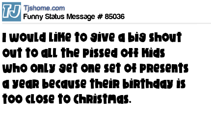 X  I would like to give a big shout out to all the pissed off kids who only get one set of presents a year because their birthday is too close to Christmas.