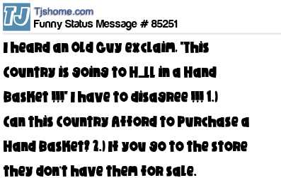 X I heard an Old Guy exclaim, "This Country is going to H_LL in a Hand Basket !!!" I have to disagree !!! 1.) Can this Country Afford to Purchase a Hand Basket? 2.) If you go to the store they don't have them for sale.