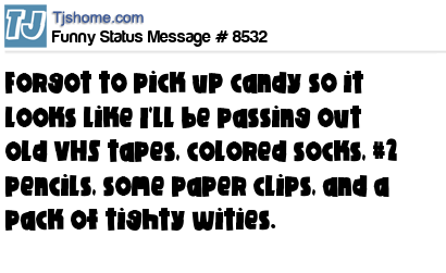 X is forgot to pick up candy so it looks like I'll be passing out old VHS tapes, colored socks, #2 pencils, some paper clips, and a pack of tighty wities.