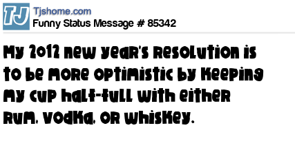 X  my 2012 new year's resolution is to be more optimistic by keeping my cup half-full with either rum, vodka, or whiskey.