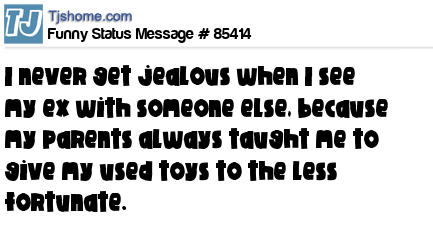 - # 42910 I never get jealous when I see my ex with someone else, because my parents always taught me to give my used toys to the less fortunate...
