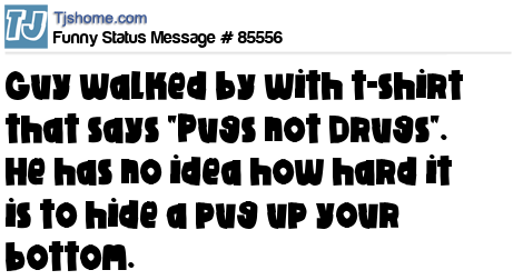 X Guy walked by with t-shirt that says "Pugs not Drugs". He has no idea how hard it is to hide a pug up your bottom.