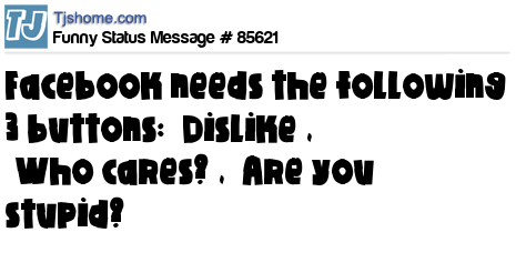 - # 57031 Facebook doesn't need a "dislike" button what it needs is a " noody effin cares" or get over yourself your really not that special button"
