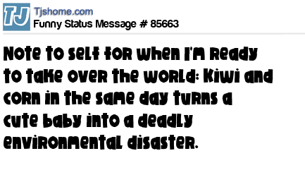 X Note to self for when I'm ready to take over the world: Kiwi and corn in the same day turns a cute baby into a deadly environmental disaster.