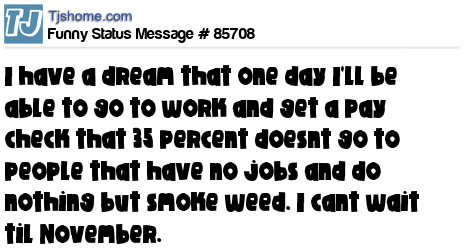 X is I have a dream that one day I'll be able to go to work and get a pay check that 35 percent doesnt go to people that have no jobs and do nothing but smoke weed. I cant wait til November.