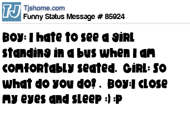 X says Boy: I hate to see a girl standing in a bus when I am comfortably seated. Girl: So what do you do? . Boy:I close my eyes and sleep :) :p