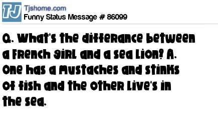 X Q. What's the differance between a French girl and a sea lion? A. One has a mustaches and stinks of fish and the other live's in the sea.