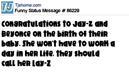 X is Congratulations to Jay-z and Beyonce on the birth of their baby. She won't have to work a day in her life, they should call her Lay-Z