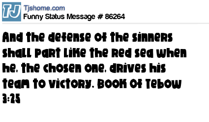 X is And the defense of the sinners shall part like the red sea when he, the chosen one, drives his team to victory. Book Of Tebow 3:25