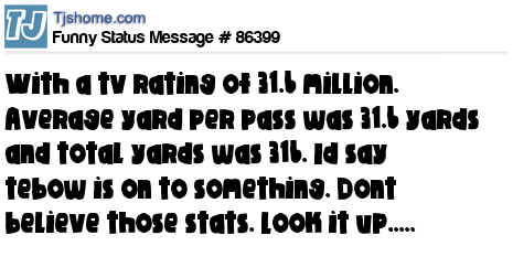X With a tv rating of 31.6 million. Average yard per pass was 31.6 yards and total yards was 316. Id say tebow is on to something. Dont believe those stats. Look it up.....