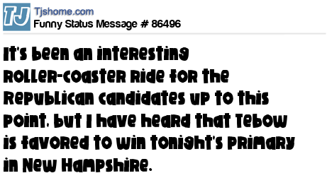 X It's been an interesting roller-coaster ride for the Republican candidates up to this point, but I have heard that Tebow is favored to win tonight's primary in New Hampshire.