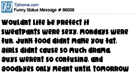 X wouldnt life be prefect if sweatpants were sexy, mondays were fun, junk food didnt make you fat, girls didnt cause so much drama, guys werent so confusing, and goodbyes only meant until tomorrow