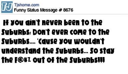 X says If you ain't never been to the Suburbs; Don't ever come to the Suburbs.... 'Cause you wouldn't understand the Suburbs... So stay the F@#% out of the Suburbs!!!