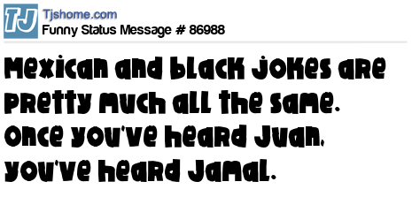 - # 102385 Mexican jokes & black jokes are all the same. Once you heard Juan, you heard Jamal.