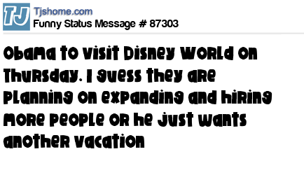- # 87280 Obama to visit Disney World on Thursday. I was there last week and a Cast Member told me villains didn't make appearances much anymore!