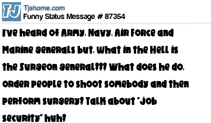 X I've heard of Army, Navy, Air Force and Marine generals but, what in the Hell is the Surgeon general??? What does he do, order people to shoot somebody and then perform surgery? Talk about "job security" huh?