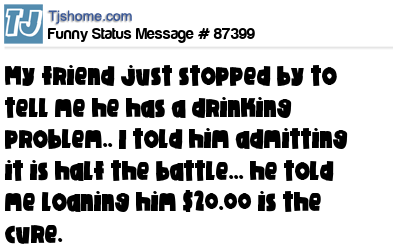 X my friend just stopped by to tell me he has a drinking problem.. I told him admitting it is half the battle... he told me loaning him $20.00 is the cure.