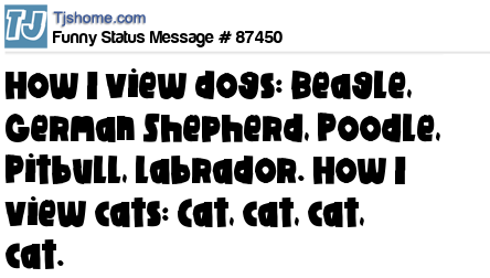 X  How I view dogs: Beagle, German Shepherd, Poodle, Pitbull, Labrador. How I view cats: Cat, cat, cat, cat.