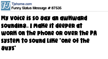 X is My voice is so gay an awkward sounding.. I make it deeper at work on the phone or over the PA system to sound like "one of the guys"