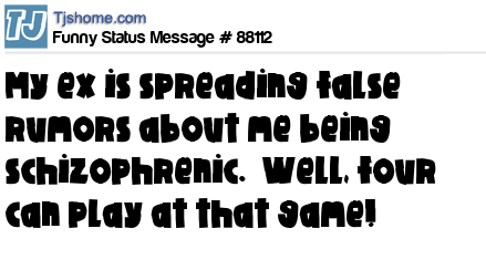 X says My ex is spreading false rumors about me being schizophrenic. Well, four can play at that game!