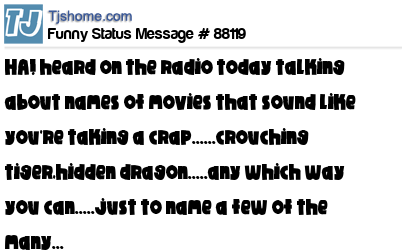 X  HA! heard on the radio today talking about names of movies that sound like you're taking a crap......crouching tiger,hidden dragon.....any which way you can.....just to name a few of the many...