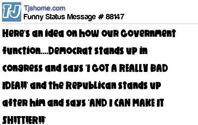 X is Here's an idea on how our Government function....Democrat stands up in congress and says 'I GOT A REALLY BAD IDEA!!' and the Republican stands up after him and says 'AND I CAN MAKE IT SH!TT!ER!!'