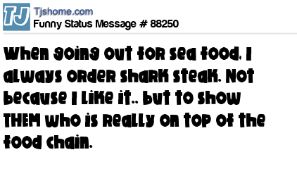 X When going out for sea food, I always order shark steak. Not because I like it.. but to show THEM who is really on top of the food chain.