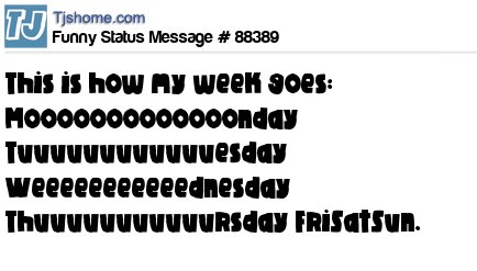 - # 72946 This is how my week goes mooooooooooooonday.. tuuuuuuuuuuuuesday... weeeeeeeeeeednesday... thuuuuuuuuuuursday.. fridaysaturdaysunday....