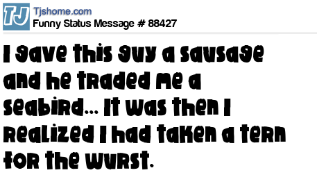 X is I gave this guy a sausage and he traded me a seabird... It was then I realized I had taken a tern for the wurst.