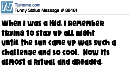 X When I was a kid, I remember trying to stay up all night until the sun came up was such a challenge and so cool. Now its almost a ritual and dreaded.