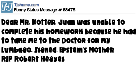 - # 88372 Mr. Kotter, Please excuse Juan from class today because he is dead. Signed: Epstein's Mom. R.I.P. Robert Hedges.