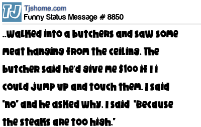 X is ..walked into a butchers and saw some meat hanging from the ceiling. The butcher said he'd give me $100 if I i could jump up and touch them. I said "no" and he asked why. I said "Because the steaks are too high."