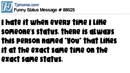 X I hate it when every time I like someone's status, there is always this person named "You" that likes it at the exact same time on the exact same status.