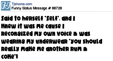 X is Said to herself "Self", and I knew it was me cause I recongized my own voice & was wearing my underwear "you should really make me another rum & coke"!