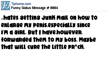 X ..hates getting junk mail on how to enlarge my penis,especially since i'm a girl. But I have,however, forwarded them to my boss. Maybe that will cure the little pr*ck.