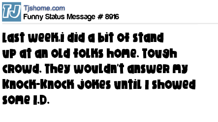 X Last week,i did a bit of stand up at an old folks home. Tough crowd. They wouldn't answer my Knock-Knock jokes until I showed some I.D.