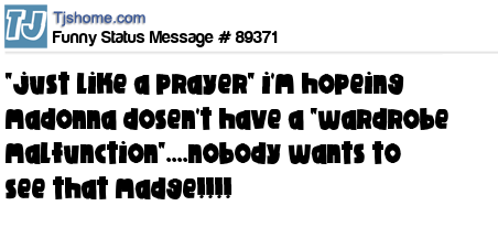 - # 82153 Are you kidding me? I hope Madonna has a wardrobe malfunction during the Super Bowl halftime show. I know it sounds sick, but I'd like to see her dong.